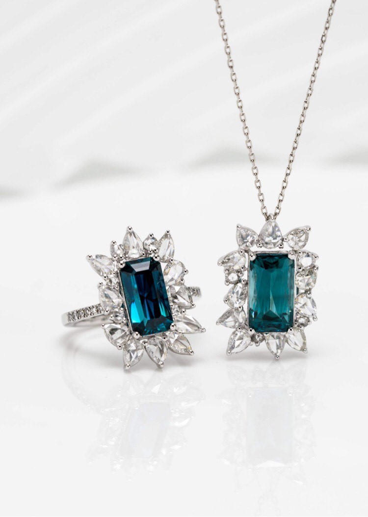 Pt・K18YG・K18WGを使用しており、存在感のある厳選された様々なカットの宝石を使い、取り巻くダイヤモンドはローズカットが施され、みずみずしい輝きと自然な透明感を放ち、身に着ける女性を新鮮かつ優雅にクラスアップしてくれるジュエリーです。