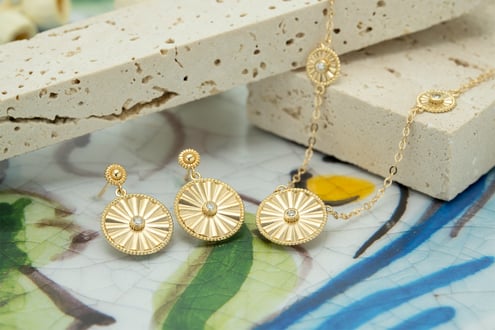 こちらのジュエリーは馬車の車輪をイメージすることができます。スタイリッシュでありながら、とても可愛いデザインは身に着けてこそ美しいものです。中央にメレダイヤをあしらっていて、アイテムはピアスとネックレスがございます。