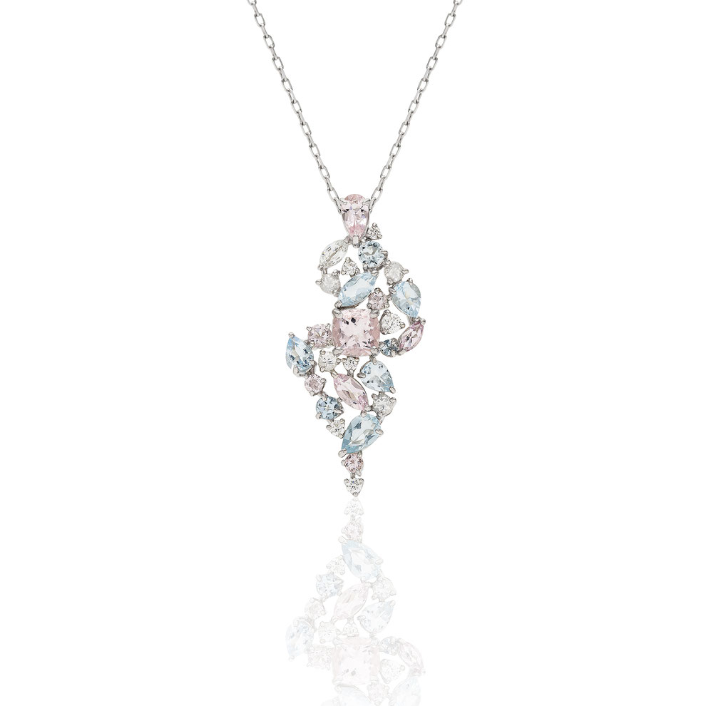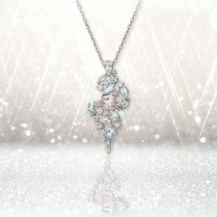 4月の誕生石に加わり、注目されている宝石「モルガナイト」は、淡いピンクの美しい宝石です。こちらのネックレスはアクアマリン、ホワイトサファイア、ダイヤモンドがその輝きを引きたてています。
